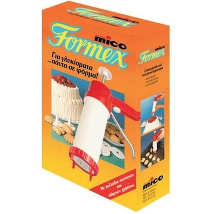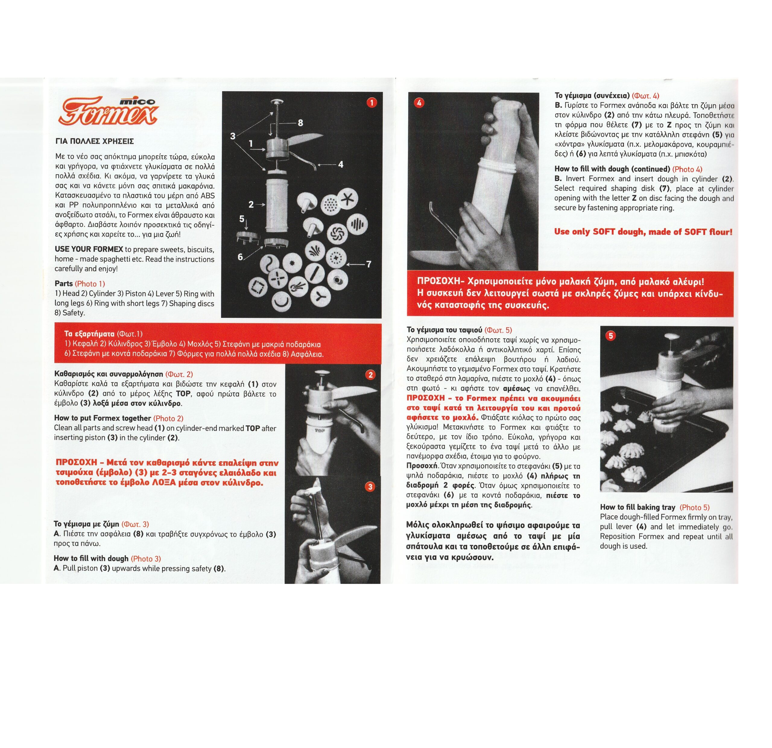 Μπισκοτομηχανή φορμέξ Ελληνικό προϊόν με ρυθμιζόμενο έμβολο για οποιοδήποτε μέγεθος κουλουριού η μπισκότου σε 16 διαφορετικά σχέδια.Περιλαμβάνει φυλλάδιο με ελληνικές οδηγίες χρήσης και συνταγές.