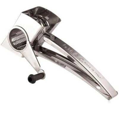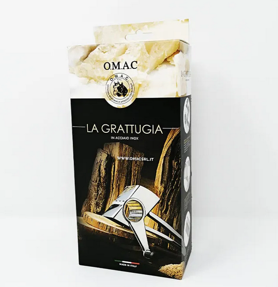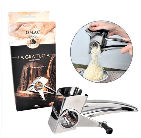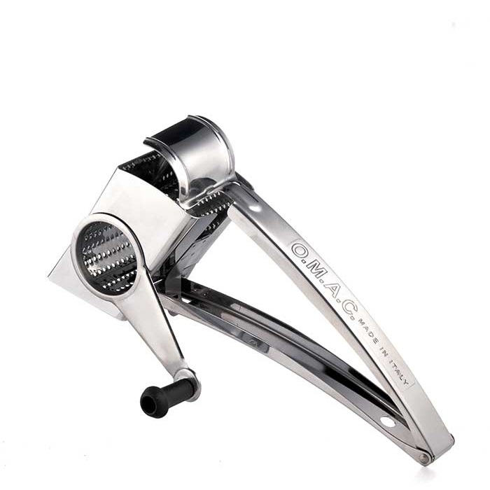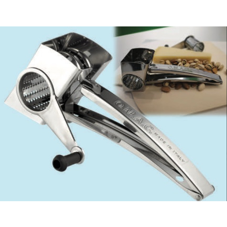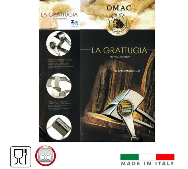 Χειροκίνητος τρίφτης από ανοξείδωτο χάλυβα από την ιταλική εταιρία O.M.A.C.. Σώμα και ρολό από ανοξείδωτο ατσάλι 18/10. Αποσυναρμολογείται εύκολα, πλένεται στο πλυντήριο πιάτων. Διαστάσεις cm. 23x10x8