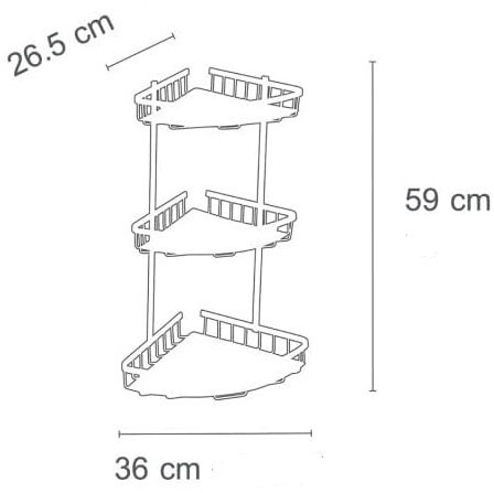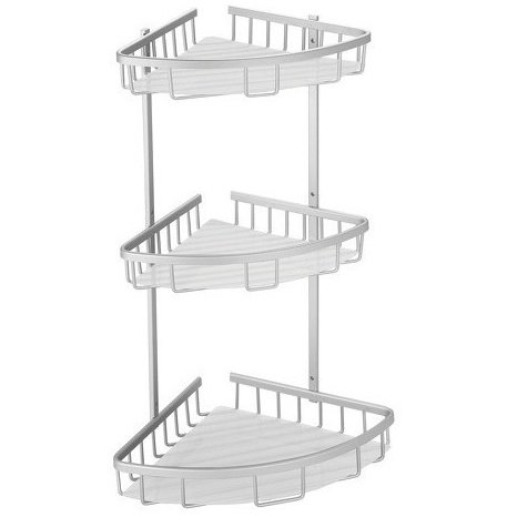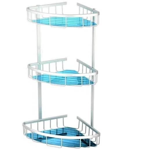 Εταζέρα γωνία 3 θέσεων αλουμίνιου δεν σκουριάζει εξαιρετικής αισθητικής με βίδες στήριξης ανοξείδωτες με διάσταση κάτω ραφιού 26 χ 26 cm πάνω ραφιών 23 χ 23 cm και με ύψος 60 cm,διαθέτη γαλάζιο διάφανο ταπέτο από πλαστικό για το κάθε ράφι