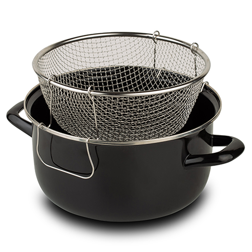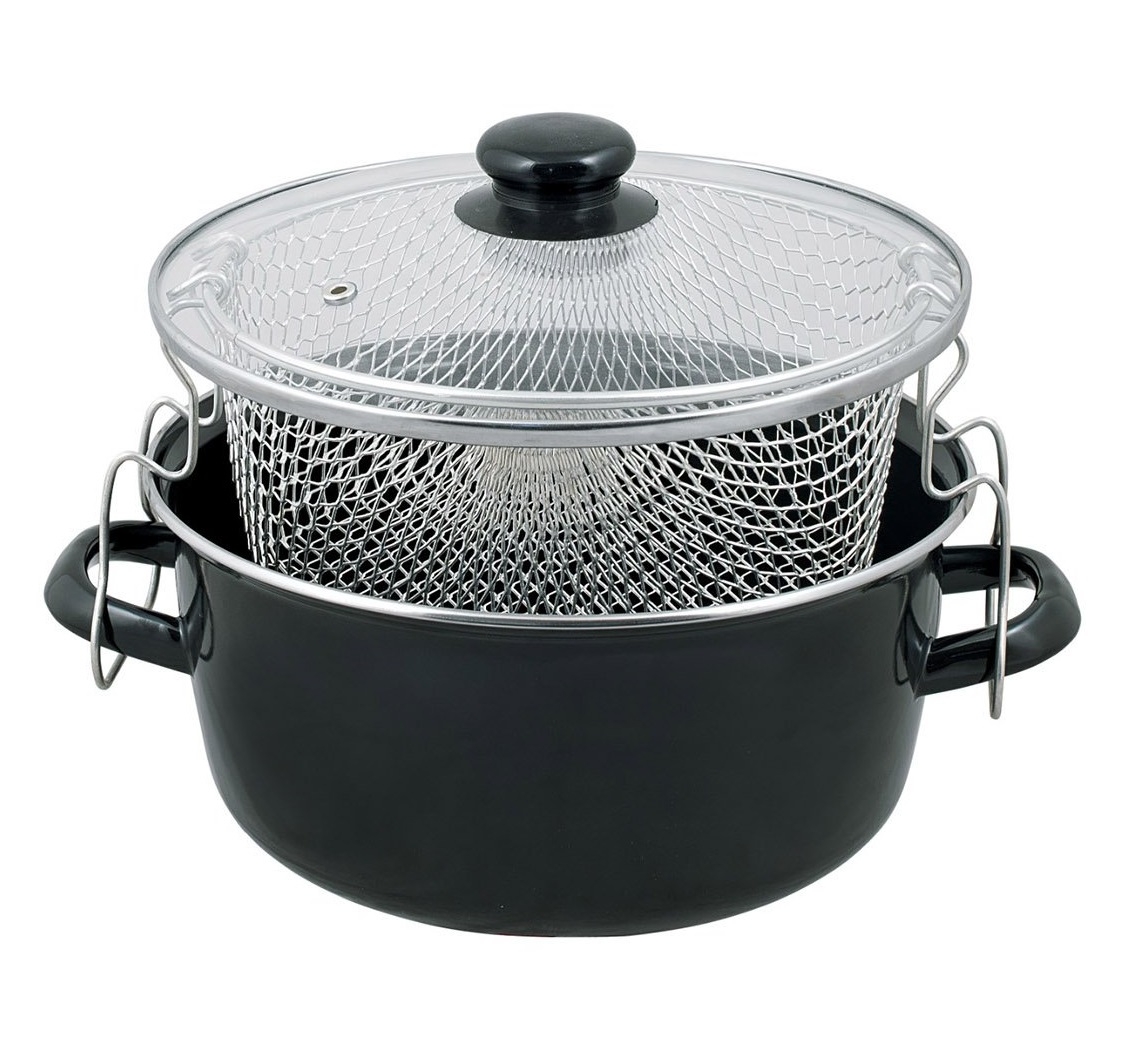 Φριτέζα εμαγιέ με αποσπώμενο καλάθι που μπορεί να χρησιμοποιηθεί σε όλες τις κατσαρόλες σας με επίστρωση σμάλτου και με γυάλινο πυρίμαχο καπάκι σε μαύρο χρώμα.και 24 εκατοστά διάμετρο και ύψος 13