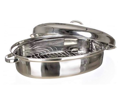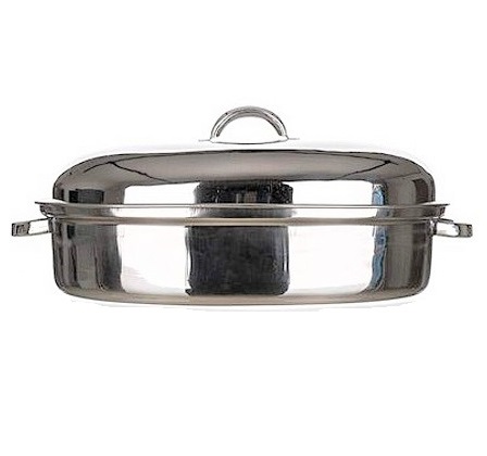 Γάστρα ανοξείδωτη οβάλ με διάσταση 26 χ 37 χωρίς τα χέρια με τα χέρια 43 εκατοστά και βάθος χωρίς το καπάκι 10 εκατοστά