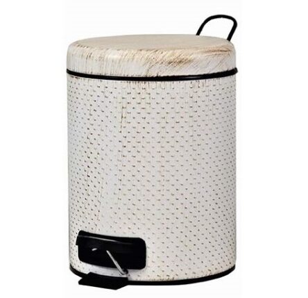 Καλάθι τουαλέτας μεταλλικό ανάγλυφο σετ αντικέ λευκό με καφέ λεπτομέρειες χρώμα,χαρτοδοχείο πεντάλ μπάνιου σε αντικέ χρώμα με πιγκάλ στο ίδιο χρώμα και σχέδιο
