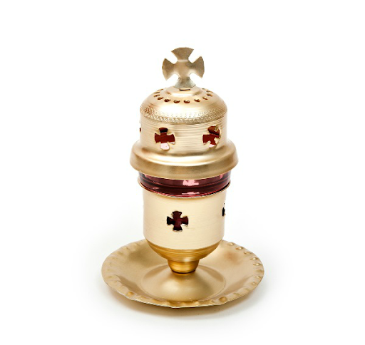 Καντήλι αλουμινίου χρυσό χρώμα μεταλλικό με σταυρό ελληνικής κατασκευής με γυάλινο χρωματιστό ποτήρι με ύψος 17 cm και πλάτος 8,5 cm
