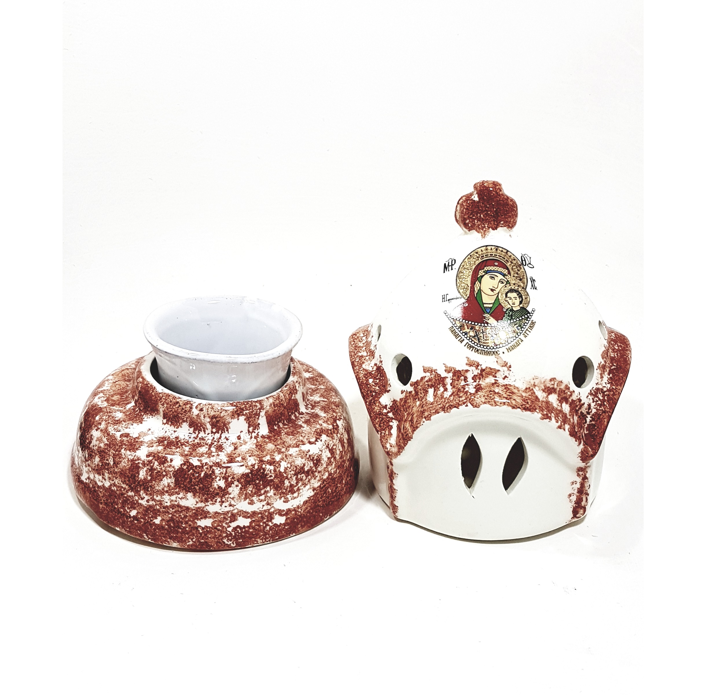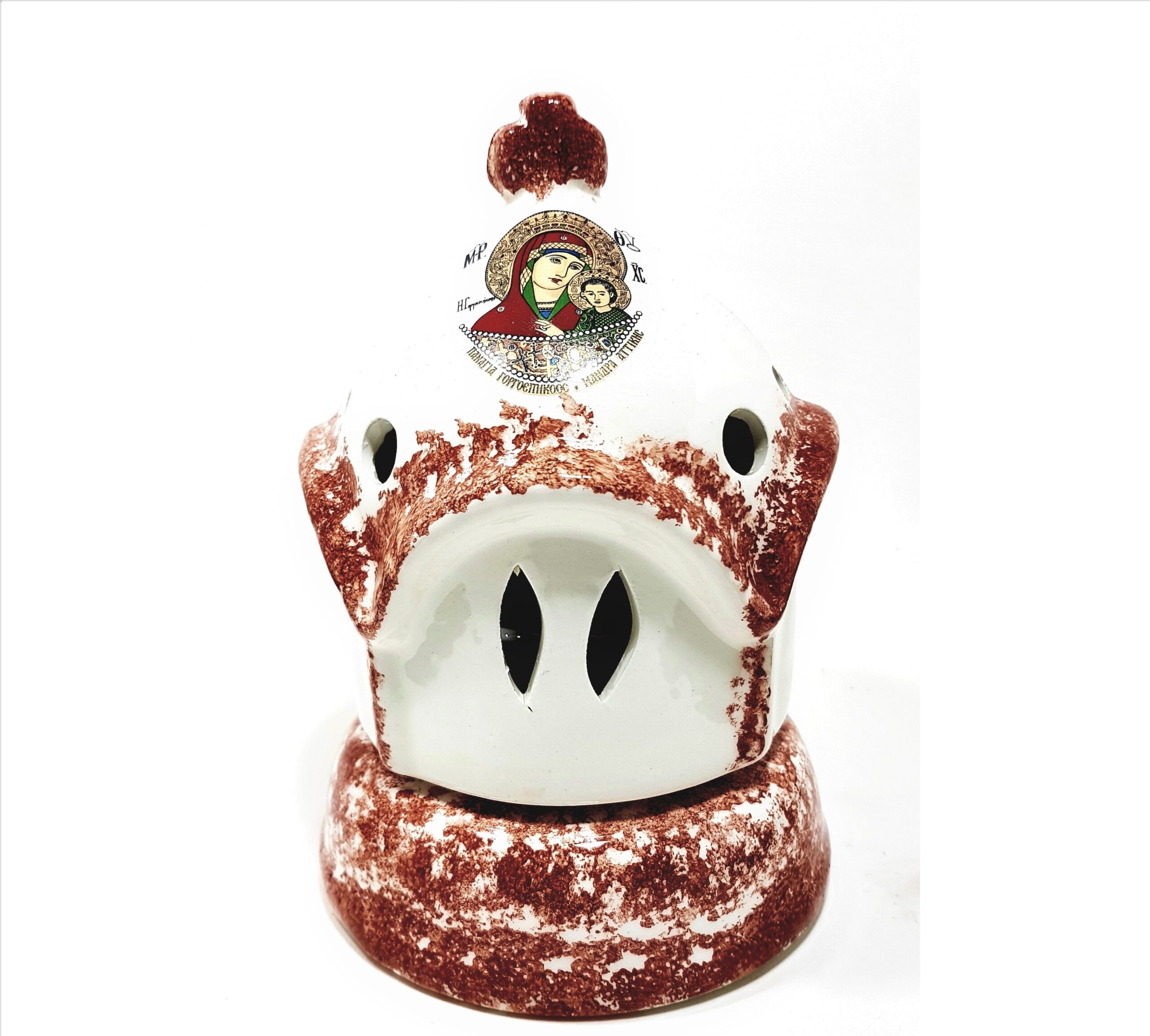Καντήλι κεραμικό τρούλος καφέ χρώμα με λευκό φόντο χειροποίητο ελληνικής κατασκευής με κεραμική καντηλόκουπα με διάσταση ύψος 19 εκ. και πλάτος 12 εκ