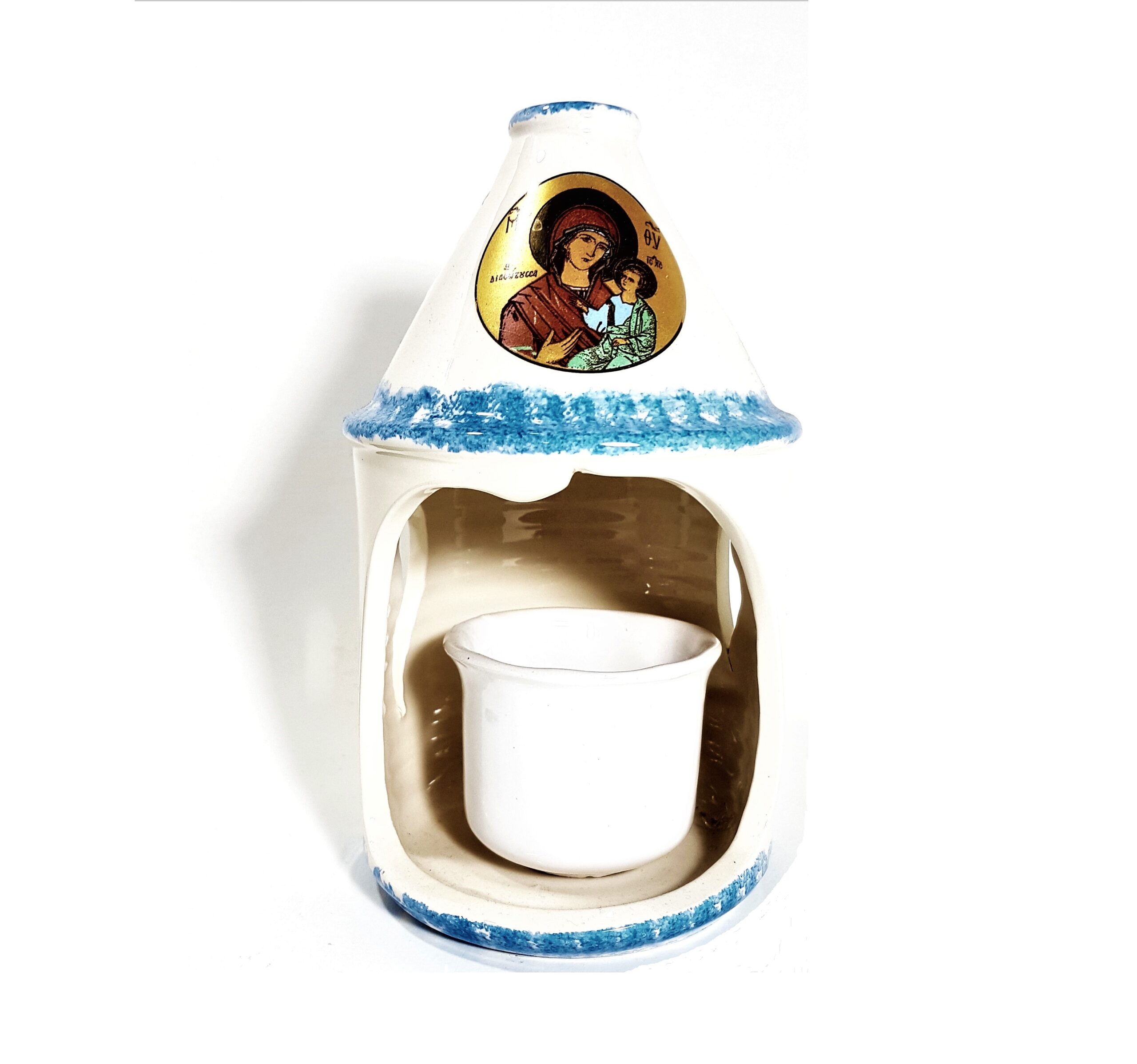 Καντήλι πήλινο μπλε χρώμα με λευκό φόντο χειροποίητο ελληνικής κατασκευής με κεραμική καντηλόκουπα με διάσταση ύψος 21 εκ. και πλάτος 13 εκ