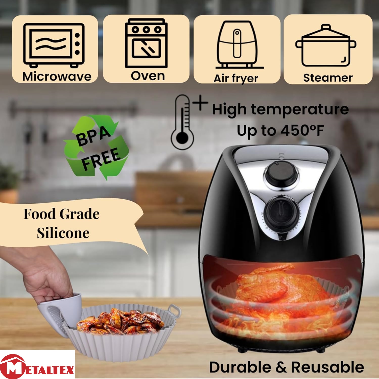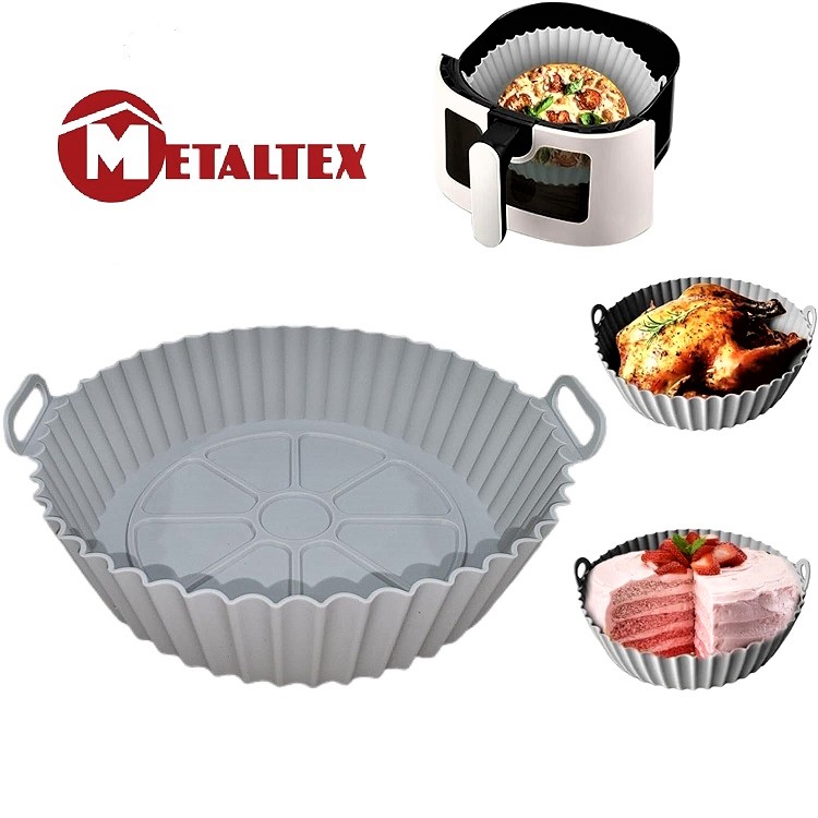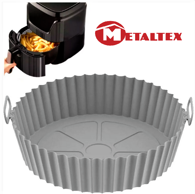 Πιάτο σιλικόνης για φριτέζα αέρος για χρήση από – 40 ως + 230 βαθμούς κελσίου από την metaltex την ιταλική εταιρεία με παράδοση στα ποιοτικά εργαλεία κουζίνας με διάμετρο 20 εκατοστά και ύψος 5 κατάλληλο και για φούρνο μικροκυμάτων Το ταψάκι σιλικόνης είναι ειδικά κατασκευασμένο για χρήση σε air fryer μπορεί να την προστατεύσει αποτελεσματικά από υπολείμματα τροφών και σας γλιτώνει από το καθημερινό καθάρισμα.