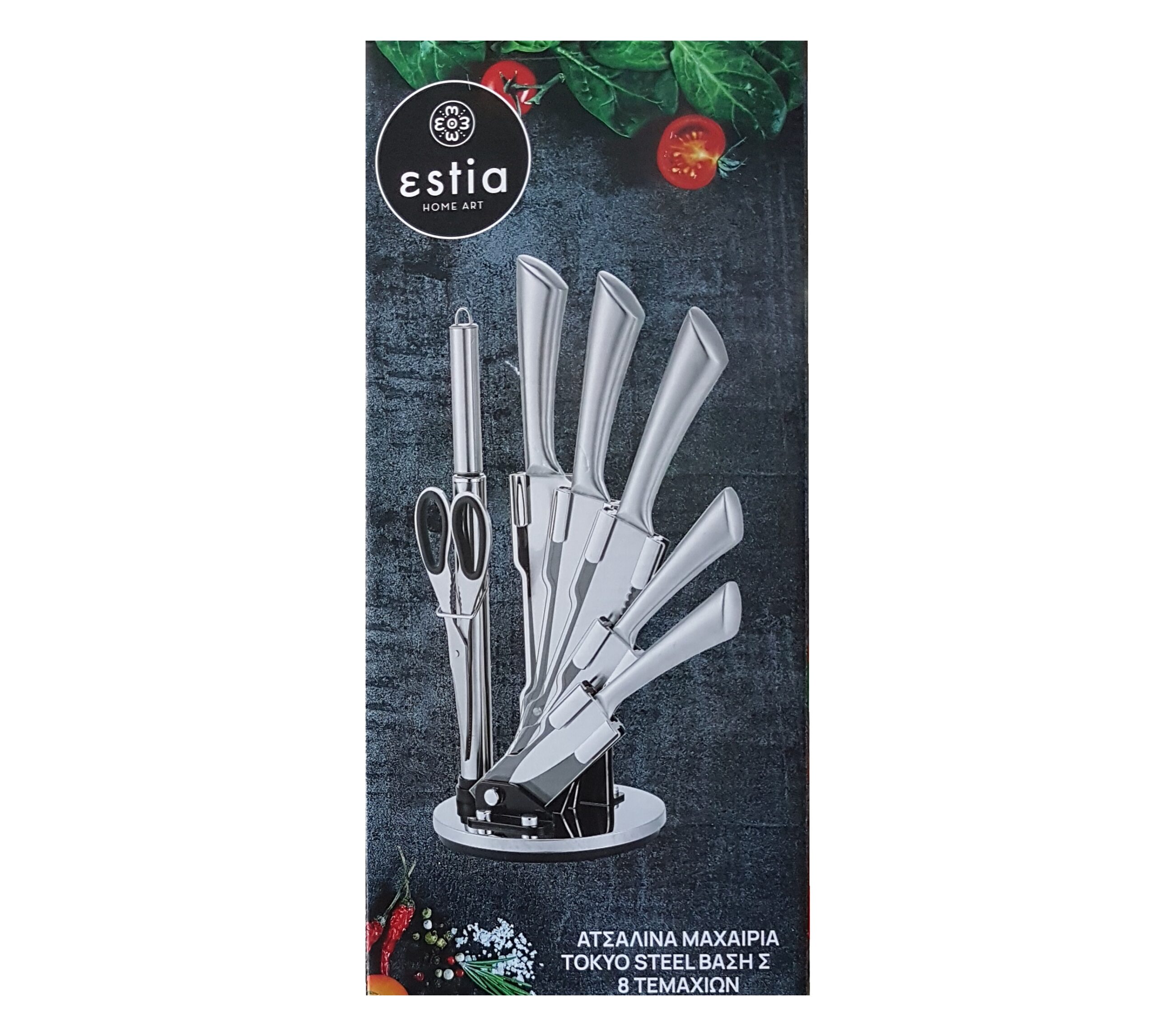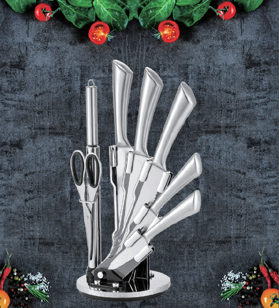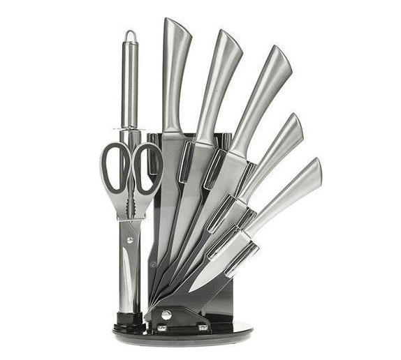 Σετ μαχαίρια με βάση διάφανη ακρυλική περιστρεφόμενη 8 τεμαχίων. Τα μαχαίρια έχουν ανοξείδωτη εργονομική λαβή και το σετ περιεχέι 1 μαχαίρι σεφ με λάμα 20 εκ.1 μαχαίρι πριονωτό ψωμιού 19,5 εκ. 1 μαχαίρι φιλτραρίσματος 19 εκ. 1 μαχαίρι γενικής χρήσεως 12 εκ. 1 μαχαίρι μικρό 9 ε. 1 ψαλίδι λαχανικών – κρεατικών και ένα μασάτι για τρόχισμα