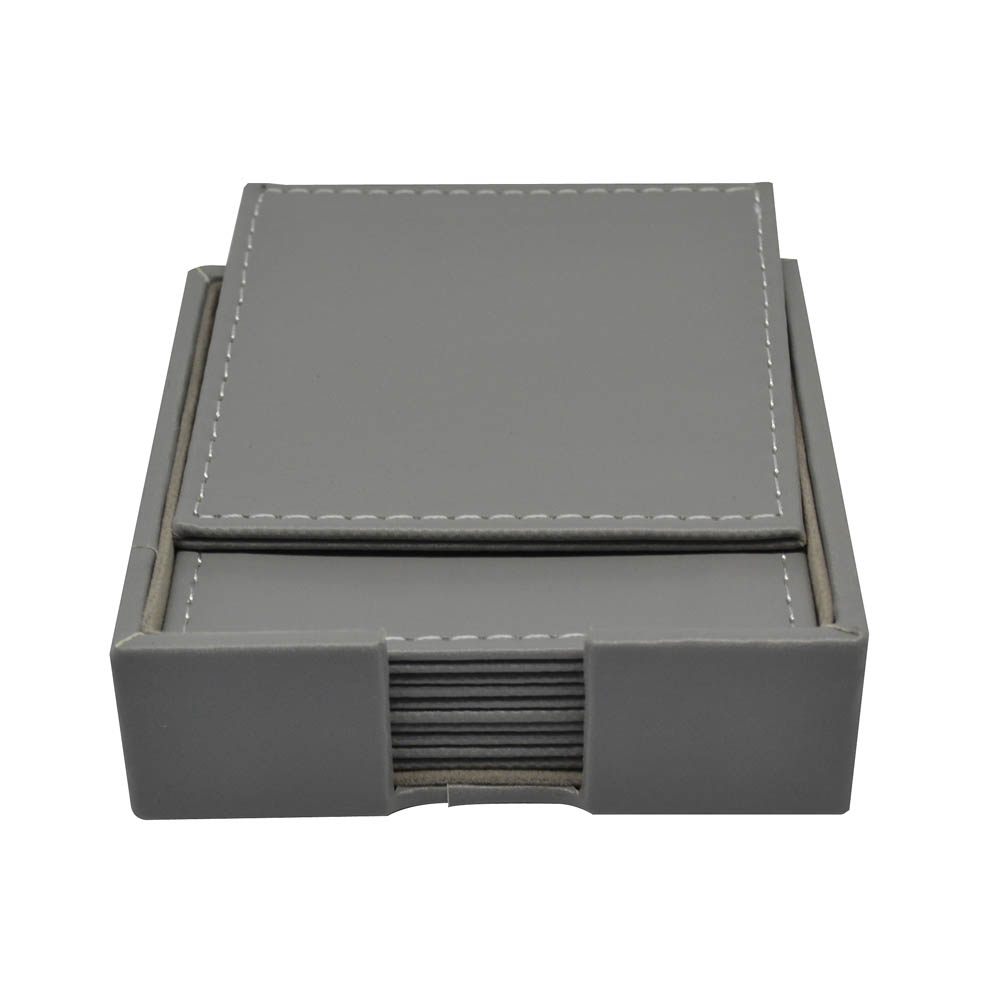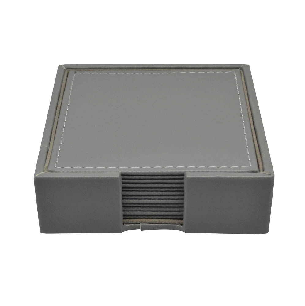 Σουβέρ δερμάτινα γκρι με λευκή ραφή στο εσωτερικό σετ 6 τεμαχίων τετράγωνα σε θηκη δερμάτινη και διάσταση 10 χ10 cm