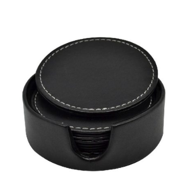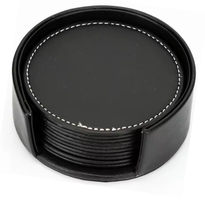 Σουβέρ δερμάτινα μαύρα με λευκή ραφή στο εσωτερικό σετ 6 τεμαχίων στρογγυλά σε θήκη δερμάτινη και διάμετρο 10 εκατοστά