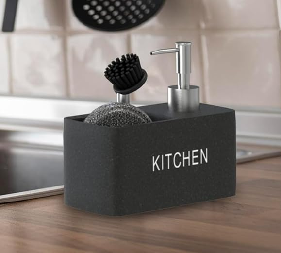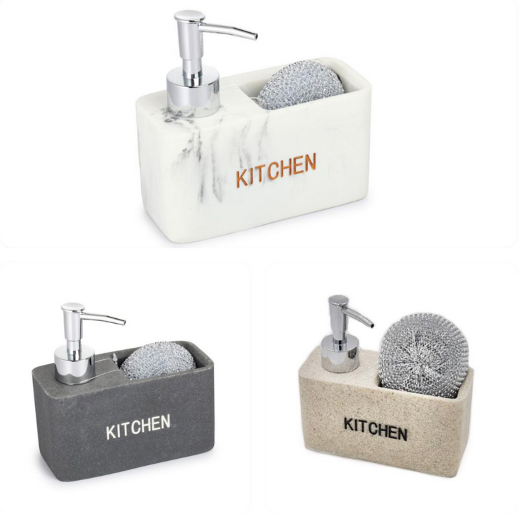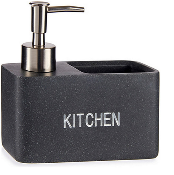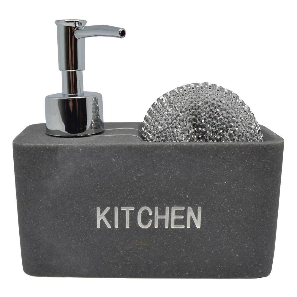 Θήκη για υγρό σαπούνι γκρι χρώμα απομίμηση πέτρας με αντλία απορρυπαντικού στην μια πλευρά και θήκη για σφουγγάρι στην άλλη με διάσταση 14 χ 14 χ 6 cm από συνθετικό υλικό μεγάλης αντοχής
