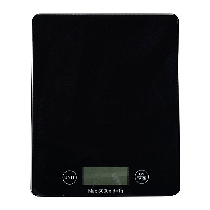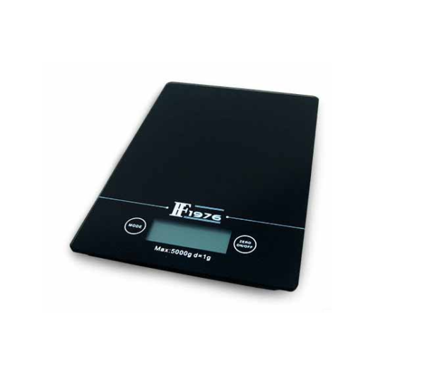 Ζυγαριά κουζίνας επίπεδη ηλεκτρονική πέντε κιλών με ακρίβεια γραμμαρίου και δυνατότητα αφαίρεσης απόβαρου λειτουργεί με δυο μπαταρίες ΑΑ [εμπεριέχονται] με διάσταση16 χ 23 cm